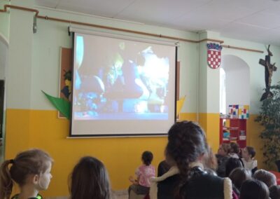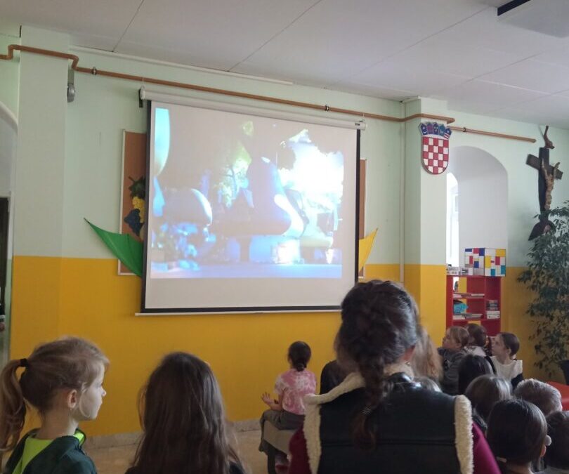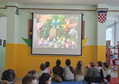 U utorak, 28.10.2025., obilježili smo Svjetski dan animiranoga filma. Davne 1892. godine na taj je dan u Parizu prikazana prva animacija Emila Reynauda i od tada je započeo razvoj animacije kao posebne filmske umjetnosti. Poželjeli smo, barem kratko, biti dio te umjetnosti pa je tijekom velikog odmora hol naše škole postao mala kino dvorana u kojoj se prikazivao animirani film “Štrumfovi”. Uživali smo u njihovim pustolovinama.