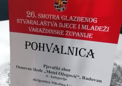 Naš pjevački zbor mlađeg uzrasta po prvi put sudjelovao je na 26. Smotri glazbenog stvaralaštva djece i mladeži Varaždinske županije u natjecateljskom dijelu programa, u A kategoriji (uzrast od 2. do 5. razreda).