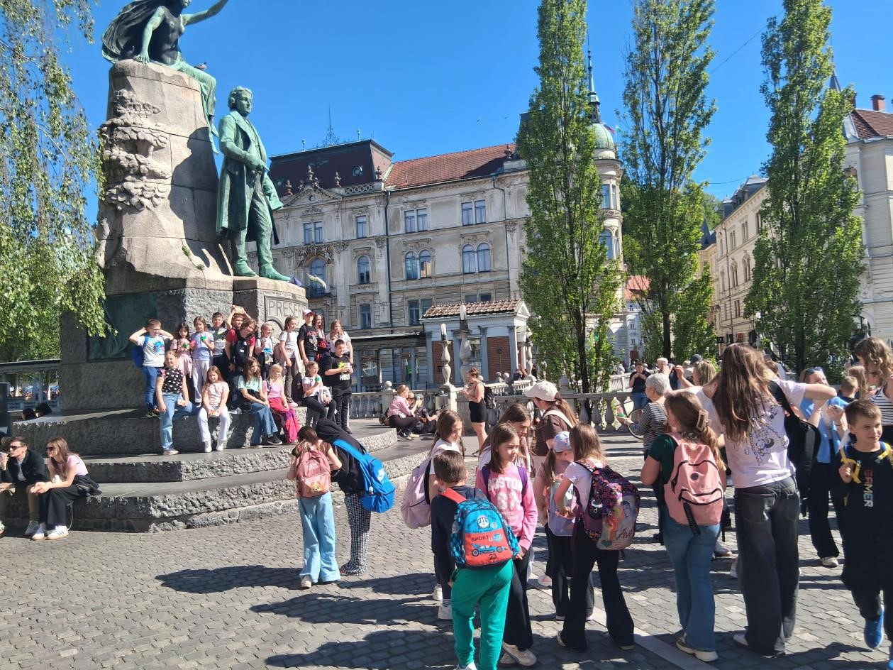 Sprehodili smo se po središču Ljubljane in videli: TROMOSTOVJE, KIP FRANCETA PREŠERNA, REKO LJUBLJANICO in še številne druge znamenitosti mesta.
