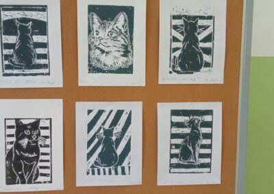 U 8. razredu učenici su radili linorez, grafičku tehniku koja zahtijeva preciznost i strpljenje. Kao motiv odabrali su mačku, a rezultati pokazuju raznolikost pristupa i izražajnosti u prikazu iste teme.